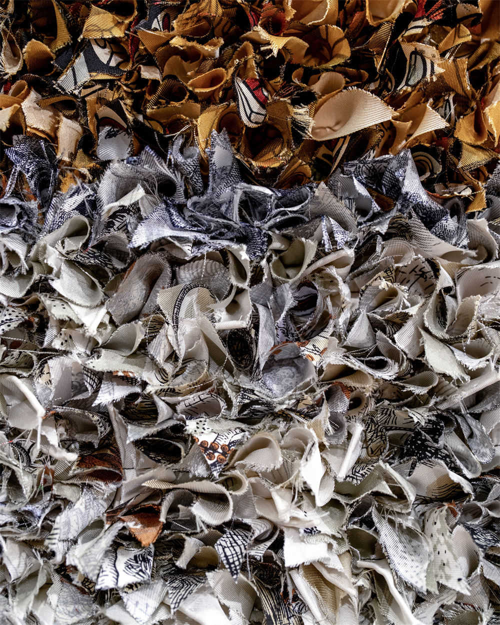 在极具现代感的迪奥展区内,四周墙面上展陈着艺术家乔尔•安德里亚诺马里索亚创作的大型装置艺术品“LES SAISONS IMAGINAIRES”(二零二一年)。该作品取自品牌往季的真丝丝巾,装裱于多块展板之上,构筑出层叠而富有诗意的视觉景观。
