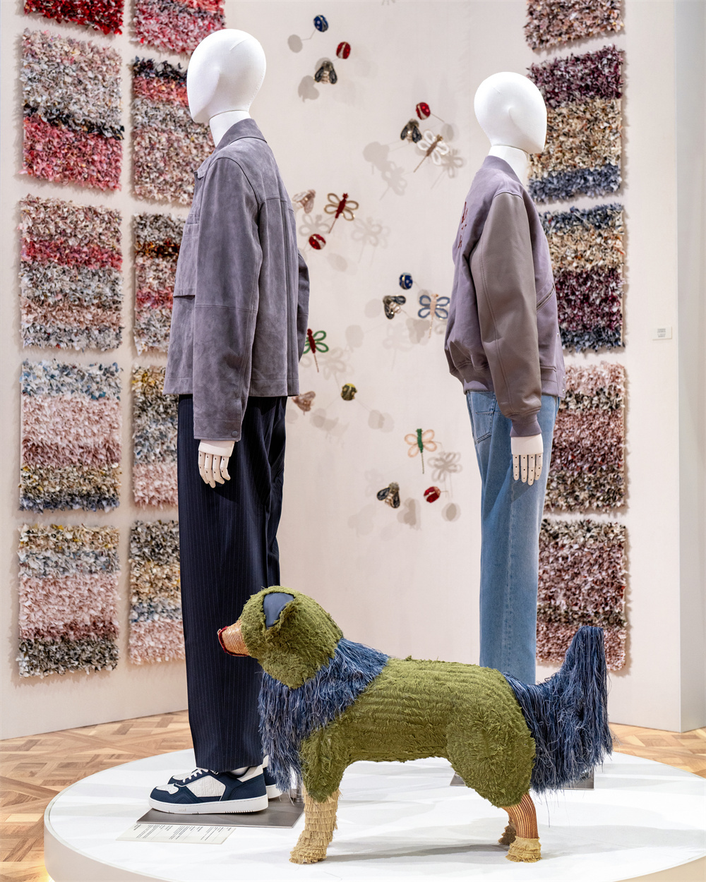 在展区中央,迪奥带来了多款以可持续理念设计的产品,涵盖男装与女装成衣系列。这些作品选用经认证的可持续面料,遵循严格的环境与社会标准,从原料、工艺到制作流程皆力求降低对生态的影响。