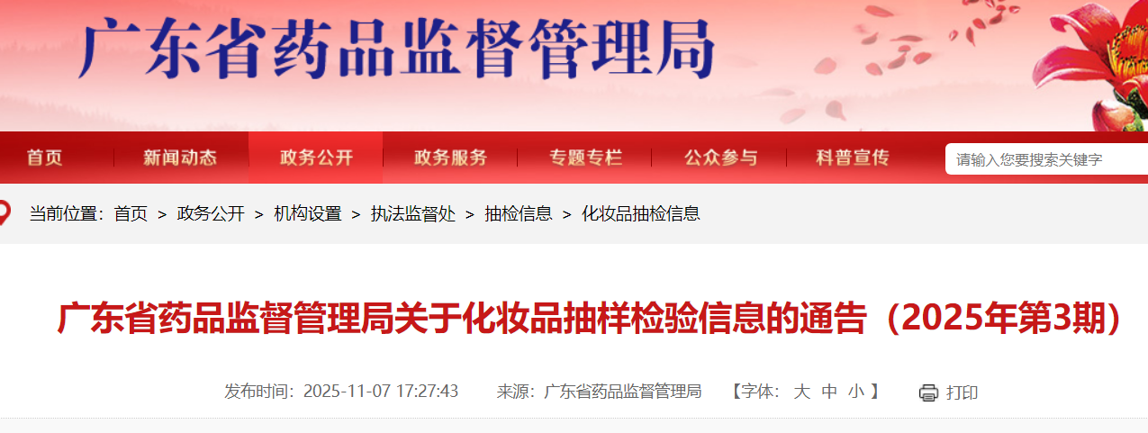 对抽检不符合规定化妆品,广东省药品监督管理局已要求相关企业和单位采取暂停销售、召回等风险控制措施,对不符合规定原因开展调查并切实进行整改。