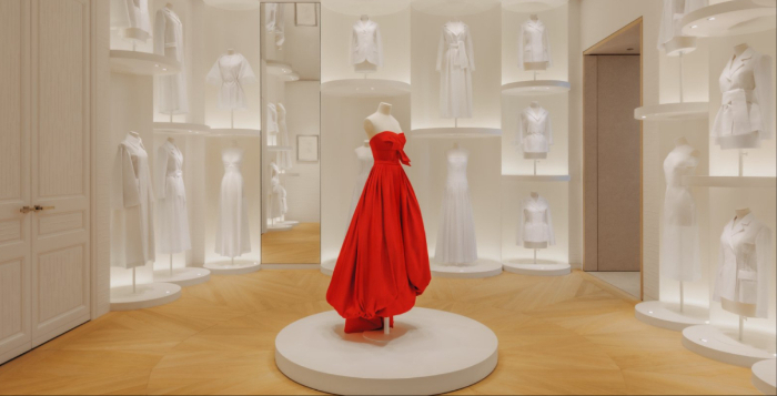 这段艺术之旅在顶层继续展开,致敬蒙田大道三十号的梦之殿堂。沿着螺旋式楼梯拾级而上——一个由OMA建筑事务所设计——陈列着白坯布礼服的艺术空间映入眼帘。这些立体装置令经典廓形焕发生机,展现迪奥工坊的卓然匠艺。纯白之境中,一袭徐徐旋动的红色舞会礼服裙尤为夺目,礼赞迪奥先生眼中的“生命之色”。