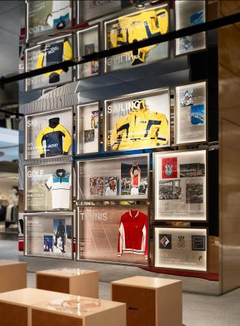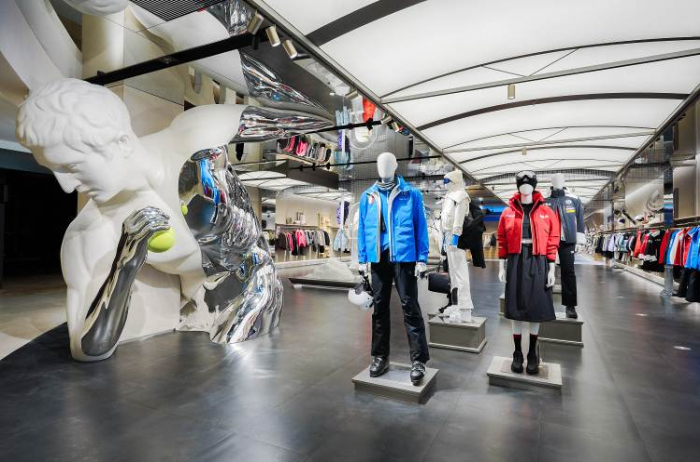 与设计语言相呼应,左侧生活区将FILA生活系列服装与精致的家居氛围摆件进行情境化搭配,让消费者能够在“生活客厅”场景中,从容选购日常生活与社交通勤所需。右侧潮流区则通过一系列模特矩阵,为追逐先锋趋势的年轻人带来引领潮流、彰显鲜明文化态度的穿搭组合。