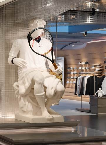 外立面以罗马斗兽场建筑为灵感,沉积岩材质的经典拱门结构叙说着品牌的意大利基因。门口伫立的巨型雕塑以《掷铁饼者》对竞技瞬间的经典定格为灵感,与店内取意自《朱利亚诺·德·美第奇像》、身披FILA经典网球单品BB1大满贯 POLO的另一座雕塑遥相呼应 ——一个手掷网球,一个手持球拍,共同演绎《网球新章》主题。