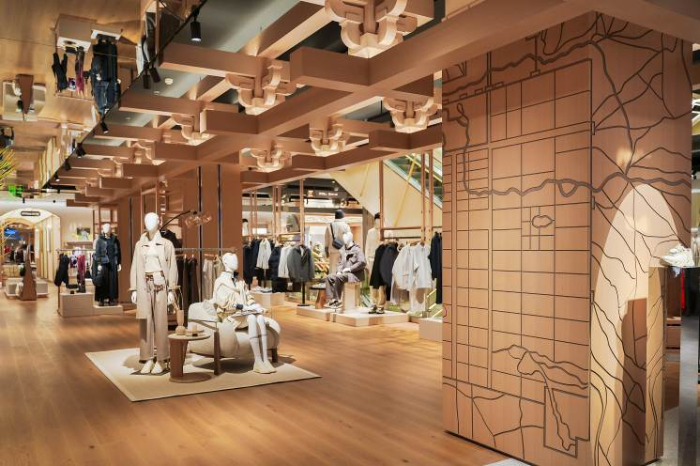 以“未来唐韵”为灵感,这一区域巧妙融合了传统中式建筑哲思与现代设计语汇。将大明宫的“抬梁式榫卯”设计进局部空间骨骼,并雕刻了唐朝宝相花纹样。这一设计在将长安建筑意象演绎为当代空间表述的同时,亦在表达品牌鼓励青年文化创新的宣言:以当代科技为“卯”、丝路精神为“榫”,打破传统与潮流的次元壁,不断突破向前。