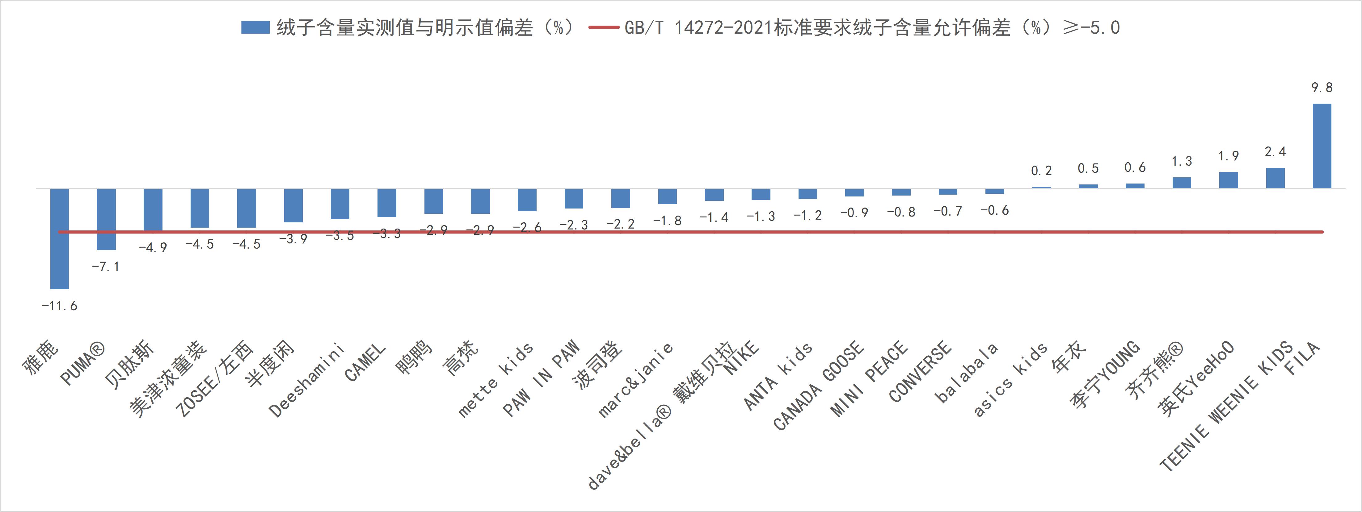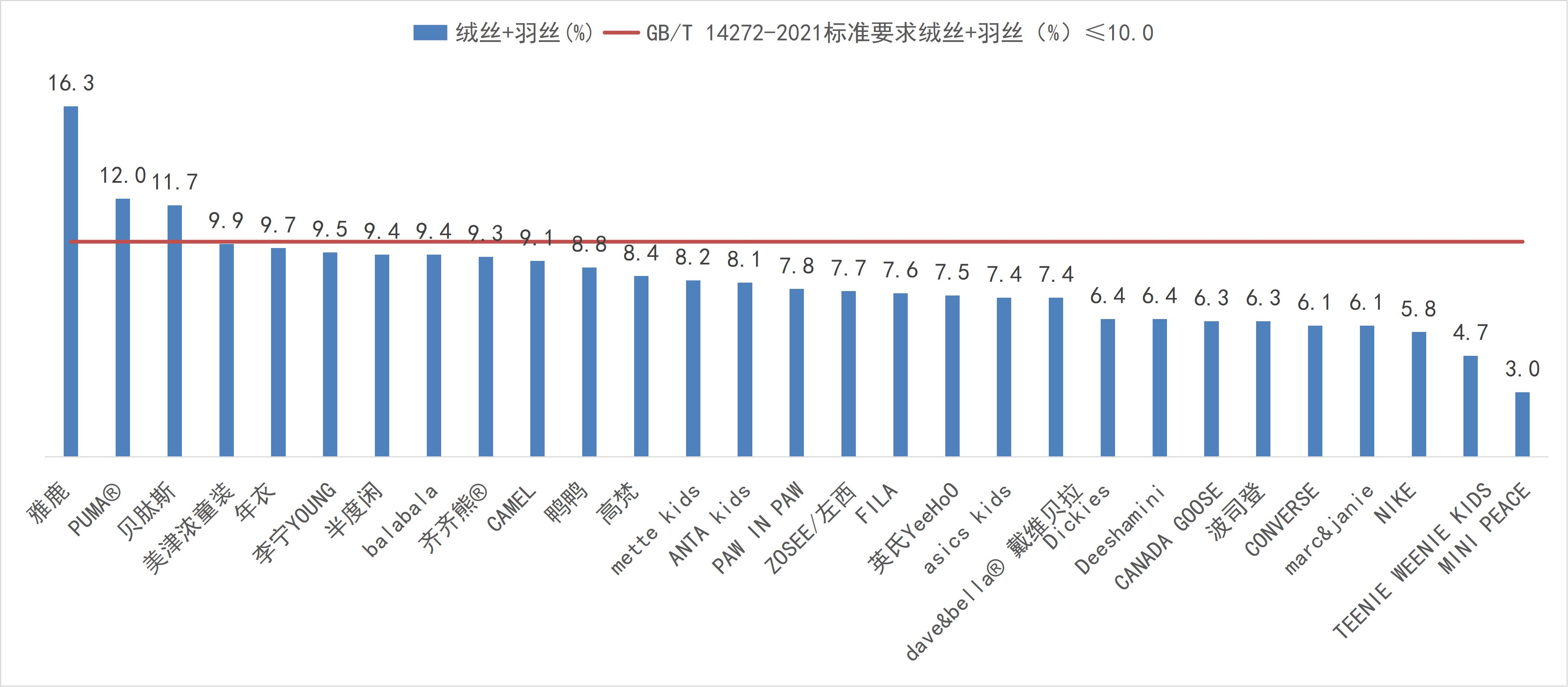 经检验,29款样品中,有1款品牌为Dickies的样品未明示绒子含量;有两款品牌为PUMA®和雅鹿的样品绒子含量未能达到国家推荐性标准GB/T 14272-2021所明示的要求;贝肽斯、PUMA®和雅鹿样品绒丝+羽丝的检测结果未能达到国家推荐性标准GB/T 14272-2021所明示的要求。