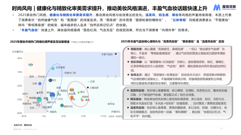 “丰盈气血妆”快速崛起。这个妆容风格的核心不再是零瑕疵底妆,而是通过杏粉、桃红、珊瑚红等贴合东方人肤质的“气血色”,营造出“面色红润、气血充足”的视觉效果。 它与高贵风、韩系、温柔风妆容的本质区别在于抓住了东方女性最核心的审美诉求:自然、健康、有生命力。