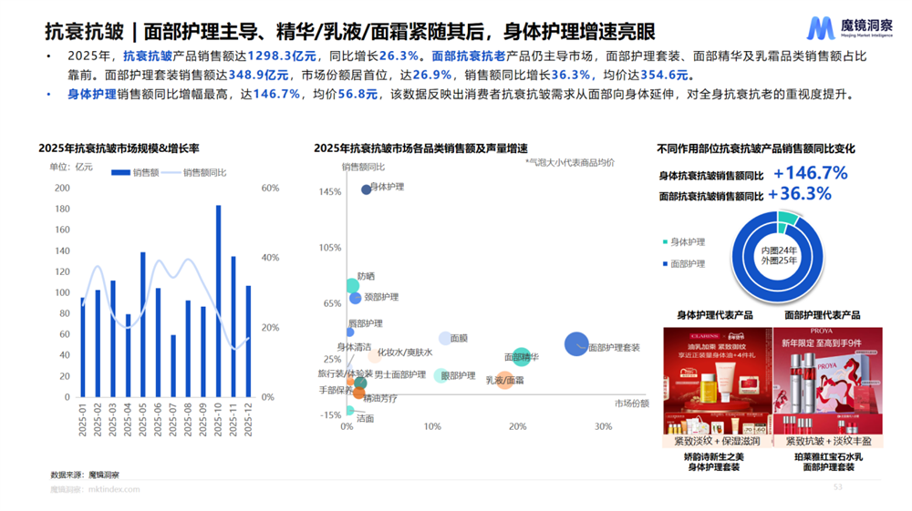 面部护理依然是抗衰的主战场,销售额接近350亿元,占据超过四分之一的市场份额,36.3%的稳健增长说明核心用户仍在持续投入。但真正值得关注的是身体护理品类——抗衰产品销售额同比暴增146.7%,虽然目前56.8元的均价远低于面部的354.6元,但揭示了巨大的市场空间。
