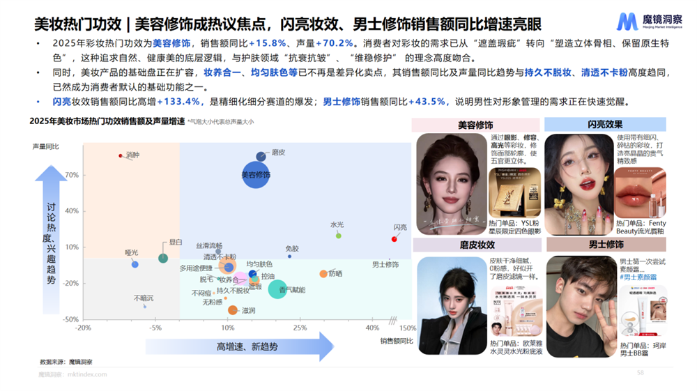 与此同时,两个高增长数据值得关注。闪亮妆效销售额同比增长133.4%,背后是消费者希望通过细闪、高光来表达个性和情绪,彩妆正在成为一种自我表达的语言。男士修饰43.5%的增长,则暗示着一个曾被忽视的市场正在觉醒,男性对形象管理的需求不再是简单的遮瑕,而是想要更精神、更得体的自己。