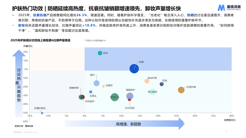 抗衰抗皱产品依然以26.3%的同比增速领跑市场,更深层的变化藏在社媒声量里:防晒讨论热度急速攀升,卸妆话题增长近两成。这背后是消费者认知的一次重要升级,越来越多的人意识到,护肤是一个连续的系统工程, 花大价钱买抗衰面霜,如果忽略了白天的防晒,效果可能大打折扣;晚上卸妆不彻底,同样会破坏皮肤屏障,让之前的保养前功尽弃。消费者逐渐意识到预防光老化、维护皮肤屏障的重要性。