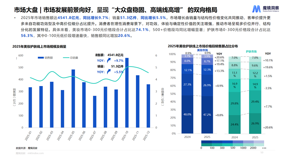 从整体数据看,2025全年销售额达到4541.8亿元,同比增长9.7%;销量51.3亿件,同比增长5.5%。但比总量更值得关注的,是背后的结构性变化。0-300元价格段的美妆产品依然占据超七成份额,护肤品类中百元以下的低价位段甚至实现了超过20%的增速。在日常护肤上,人们不再盲目追求高价,务实成为主流选择。