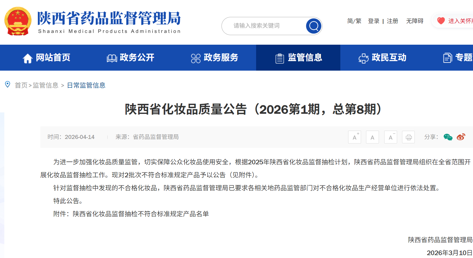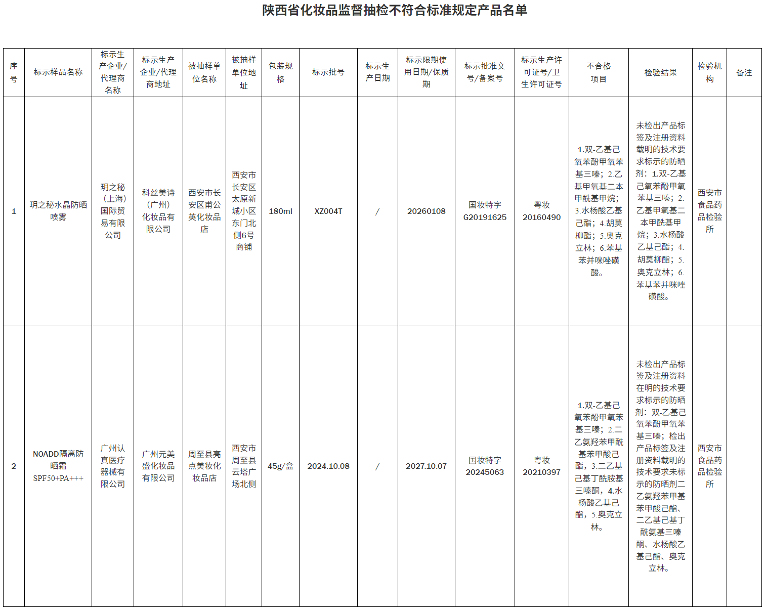 为进一步加强化妆品质量监管,切实保障公众化妆品使用安全,根据2025年陕西省化妆品监督抽检计划,陕西省药品监督管理局组织在全省范围开展化妆品监督抽检工作。现对2批次不符合标准规定产品予以公告(见附件)。