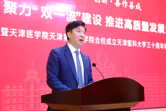 校长郝继辉在致辞中对各级领导、各界朋友长期以来对天津医科大学的关心与支持表示衷心的感谢!他从天津医学院、天津第二医学院兴建讲起,回顾了天津医学院天津第二医学院合校成立天津医科大学及30年以来发展的光辉历程。他指出,合校成立天津医科大学为学校抢抓国家战略发展机遇,乘势而上,实现跨越式发展打下了坚实基础。成立天津医科大学后,学校坚持以一流学科引领一流大学建设,落实立德树人根本任务,打造高水平师资队伍,矢志勇攀学术高峰,服务人民健康福祉,1996年成为天津市唯一的国家“211工程”重点建设市属院校,进入新时代,连续两轮入选国家“双一流”建设高校,在波澜壮阔的历史画卷中留下了熠熠生辉的发展烙印。