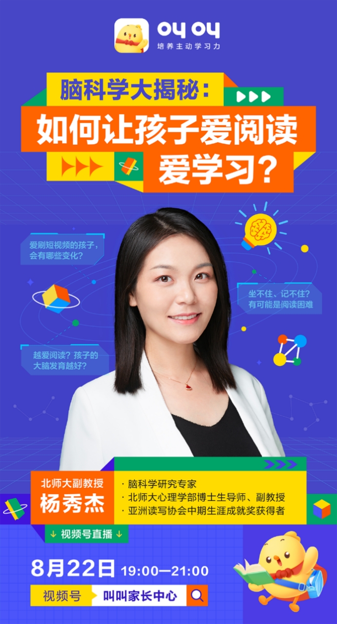 日前,脑科学研究专家、北京师范大学心理学部副教授、博士生导师杨秀杰做客在叫叫家长中心《大咖来啦》栏目,带来了一场主题为《脑科学大揭秘:如何让孩子爱阅读、爱学习》的精彩直播,从脑科学的角度,为广大家长分享了一系列亲子教育干货,帮助家长走好孩子开学第一课。