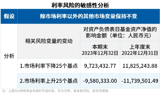 如下图,展示的是A债基年报中“利率风险的敏感性分析”部分。可以看出,站在23年年末这个时间点,如果只考虑市场利率的变化,当市场利率下降25个基点时,该债基的资产净值会上浮9,723,432.77元。