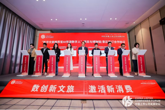 论坛现场,系列项目签约、发布。图为“新华文旅推荐官AI伴游数字人”项目与博物馆/景区签订合作协议。 新华网发