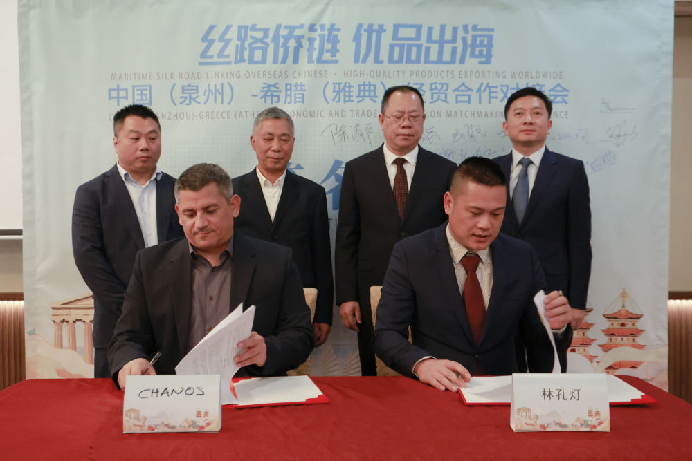 4月10日,希腊客商与当地侨商在“丝路侨链·优品出海”--中国(泉州)-希腊(雅典)经贸合作对接会上签署合作备忘。新华社发 王洪普 摄