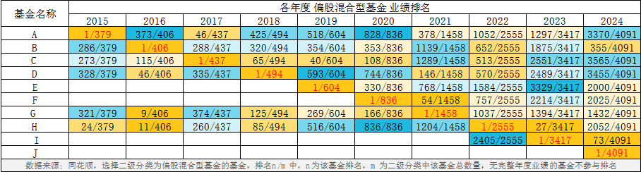 我们以偏股混合型基金指数代表主动投资,从2015年-2024年的排名来看: