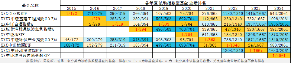 2015-2024年,收益排名第一的被动指数型基金,此后历年收益排名如下: