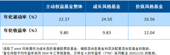 而在风险收益特征方面,下表展示了近五年成长、价值风格的主动权益基金的年化波动率和收益率数据。整体来看,成长风格基金的年化波动率明显高于价值风格的基金,说明其风险水平整体高于价值风格基金。