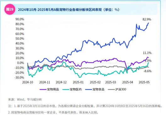 随着国产宠物品牌市场竞争力持续增强,资本市场对此给予了积极回应,直接推动了相关板块的显著增长。据《2025年中国宠物行业市场报告》数据,截至2025年第一季度,A股涉及宠物业务的上市公司达25家,其中包括5家宠物食品公司,该板块区间涨幅高达82.9%。这一市场表现源于多家宠物食品上市公司业绩的亮眼增长,从而印证了行业整体的强劲发展势头。