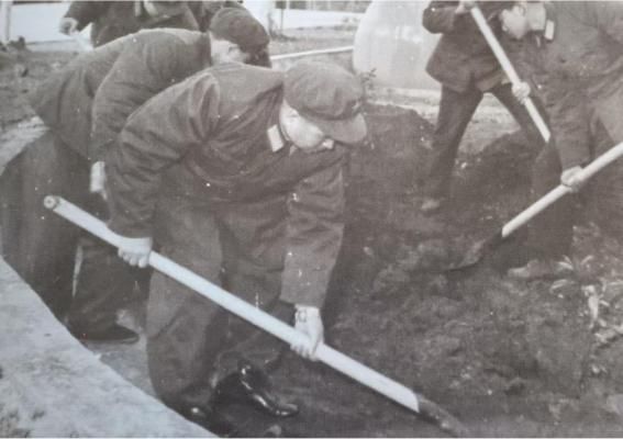 武汉市汉口城区1983年7月间发生两次暴雨。治水刻不容缓,为支援黄孝河排渍工程建设,原武汉军区空军党委主动请缨,抽调4000多名指战员与武汉市人民一起,经过5个冬春的艰苦奋斗,根治了黄孝河隐患。图为原武汉军区空军政委康星火(左一)在施工现场挥锹铲土。