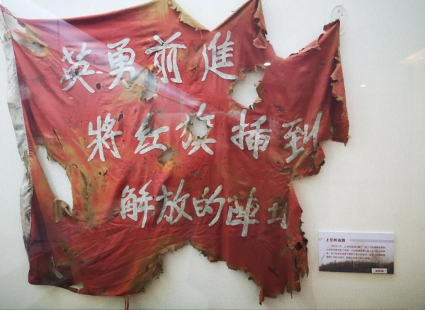 志愿军第15军第45师134团3营8连官兵在上甘岭浴血奋战43天,坚守坑道14昼夜,参战138人,连队3次打光又3次重建,先后从16个单位补入355人,共伤亡254人,组织各类战斗100多次。八连以伤亡254人的代价,歼敌1765人,最终将布满381个弹孔的战旗插上了上甘岭主峰,为战役胜利奠定坚实基础,战后八连荣获“上甘岭特功八连”的荣誉称号。图为现存放于中国人民革命军事博物馆的战旗。