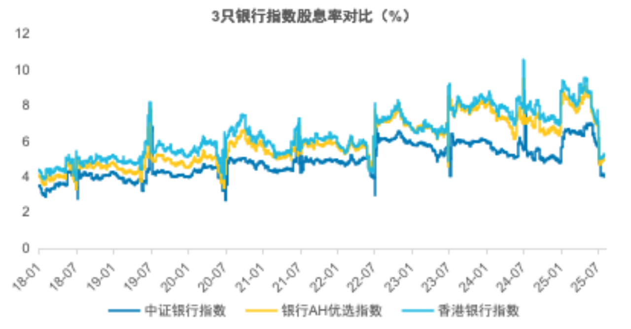 截至2025年8月11日,中证银行指数、银行AH优选指数和香港银行指数的股息率分别为4.02%、4.96%和5.17%,且从2018年以来的历史数据来看,三者的股息率在多数时间也呈现香港银行指数>银行AH优选指数>中证银行指数的排序。这背后主要是由A股与港股的估值差异、中资银行与外资银行的分红支付率水平差异等因素导致的。