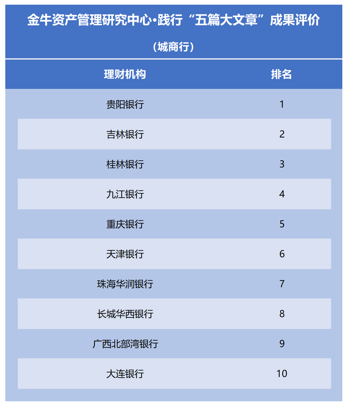“五篇大文章”对于统筹推进经济和金融高质量发展具有重要意义。金牛资产管理研究中心推出的银行理财行业践行“五篇大文章”成果评价体系,旨在助力行业践行金融“五篇大文章”落地工作,推进理财行业高质量发展和金融强国建设。该评价体系课题组由来自权威科研院所、著名高校、央企和权威媒体等机构的专家组成。在“五篇大文章”最新成果评价中,贵阳银行在非理财公司城商行类理财机构中名列第一。