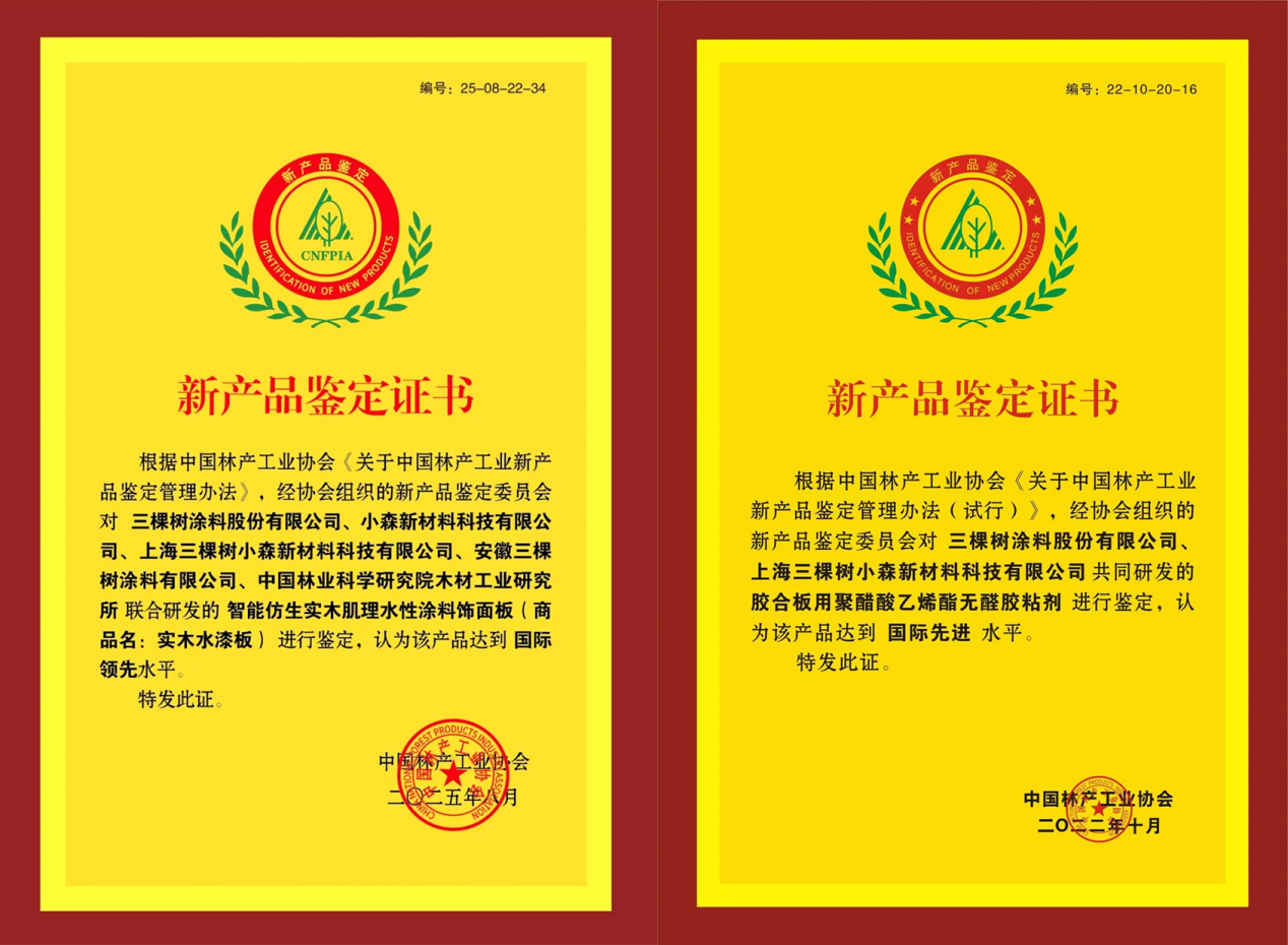 近日,三棵树联合中国林业科学研究院木材工业研究所研发的“智能仿生实木肌理水性涂料饰面板”(以下简称“实木水漆板”),经中国林产工业协会组织专家鉴定,被一致认定达到“国际领先”水平。此前,三棵树自主研发的“胶合板用聚醋酸乙烯酯无醛胶粘剂”(商品名:绿芯胶)也已获评“国际先进”。