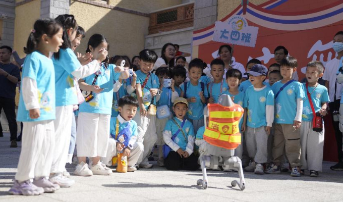 参加活动的小朋友们围观消防机器狗