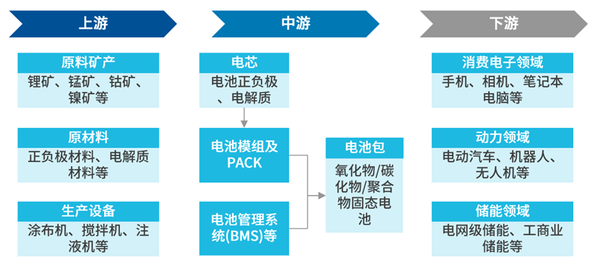 简单来说,锂电池产业链就是从​​关键材料和专用设备​​(上游),经过​​电池设计制造​​(中游),最终应用到​​消费电子、动力、储能等各种领域​​(下游)的过程:
