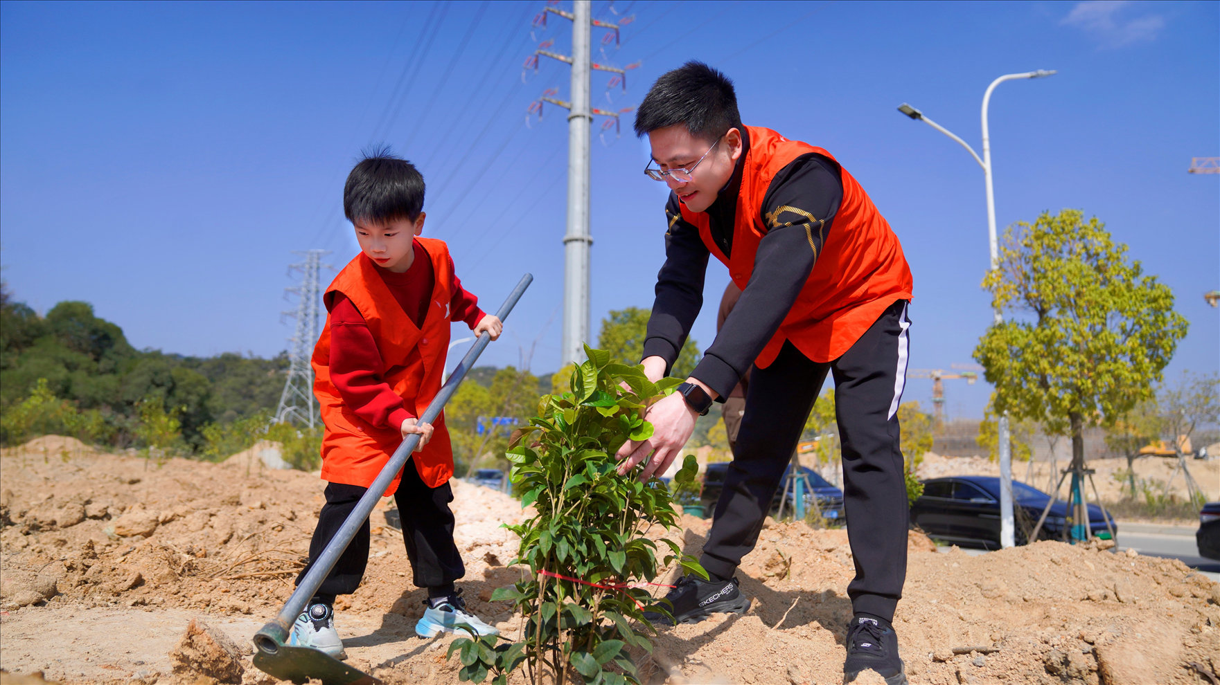 植树现场,志愿者们分工协作,有人挥锹铲土、有人扶苗定根、有人提水浇灌,配合默契,一派热火朝天的忙碌景象,明媚暖阳下,新栽下的苗木错落挺立,带着生机与希望扎根在这片土地之中。