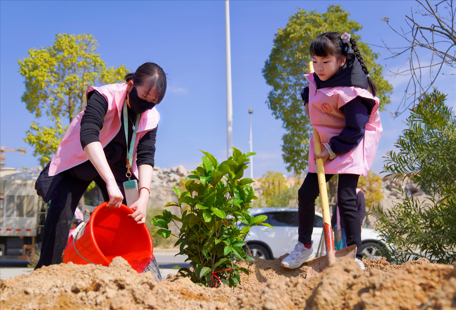亲子共植新绿。