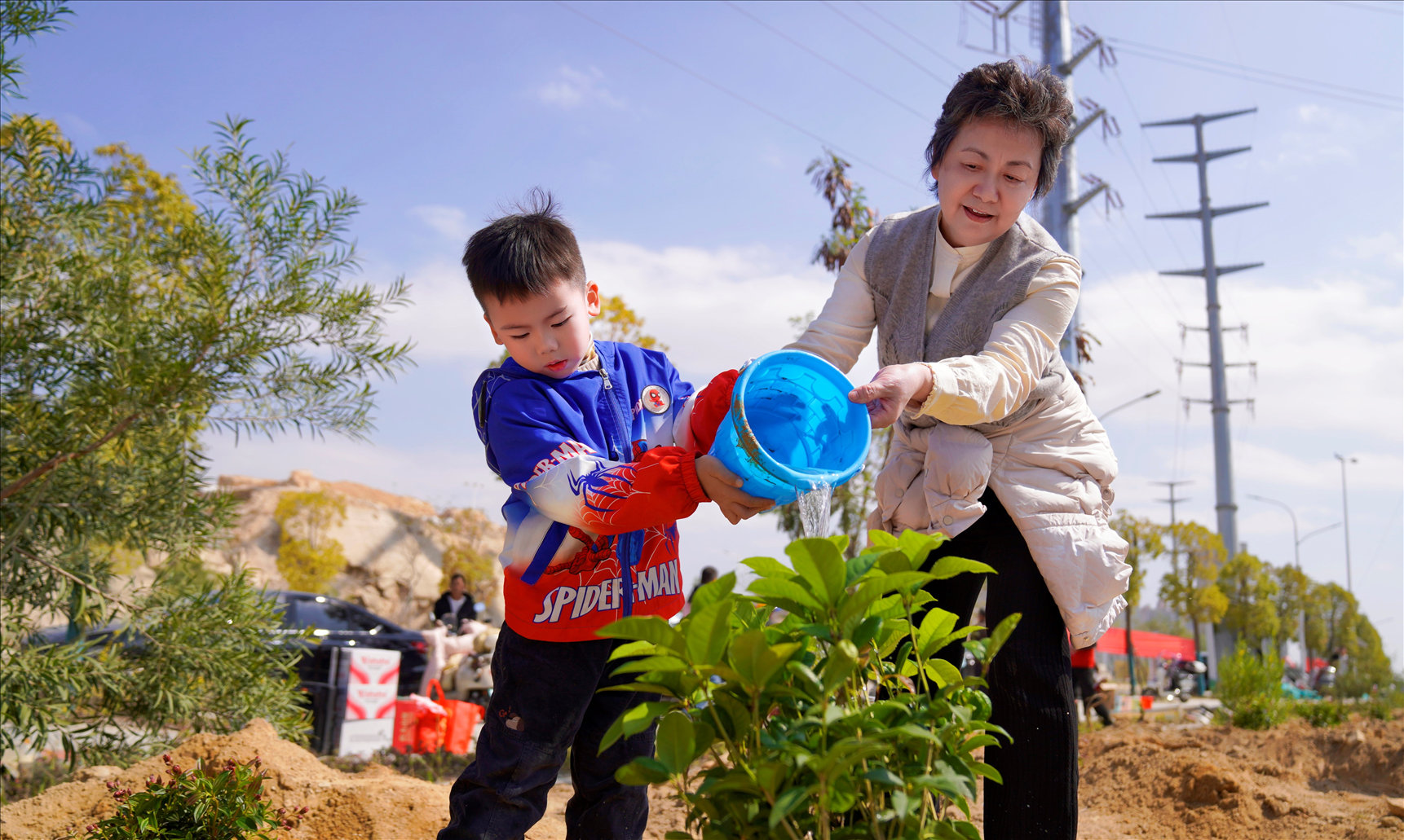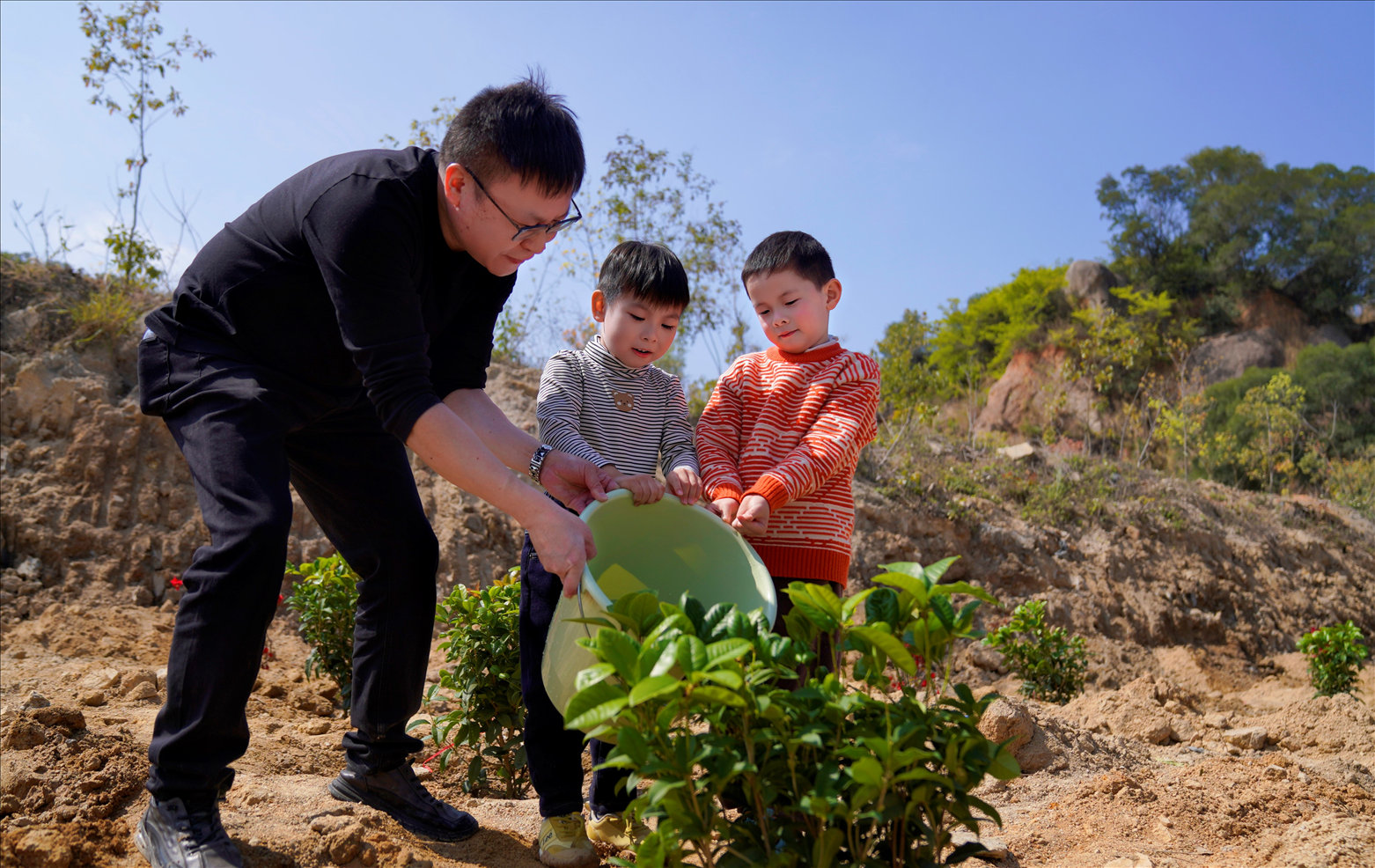 家长与孩子共同浇灌刚种下的绿植。
