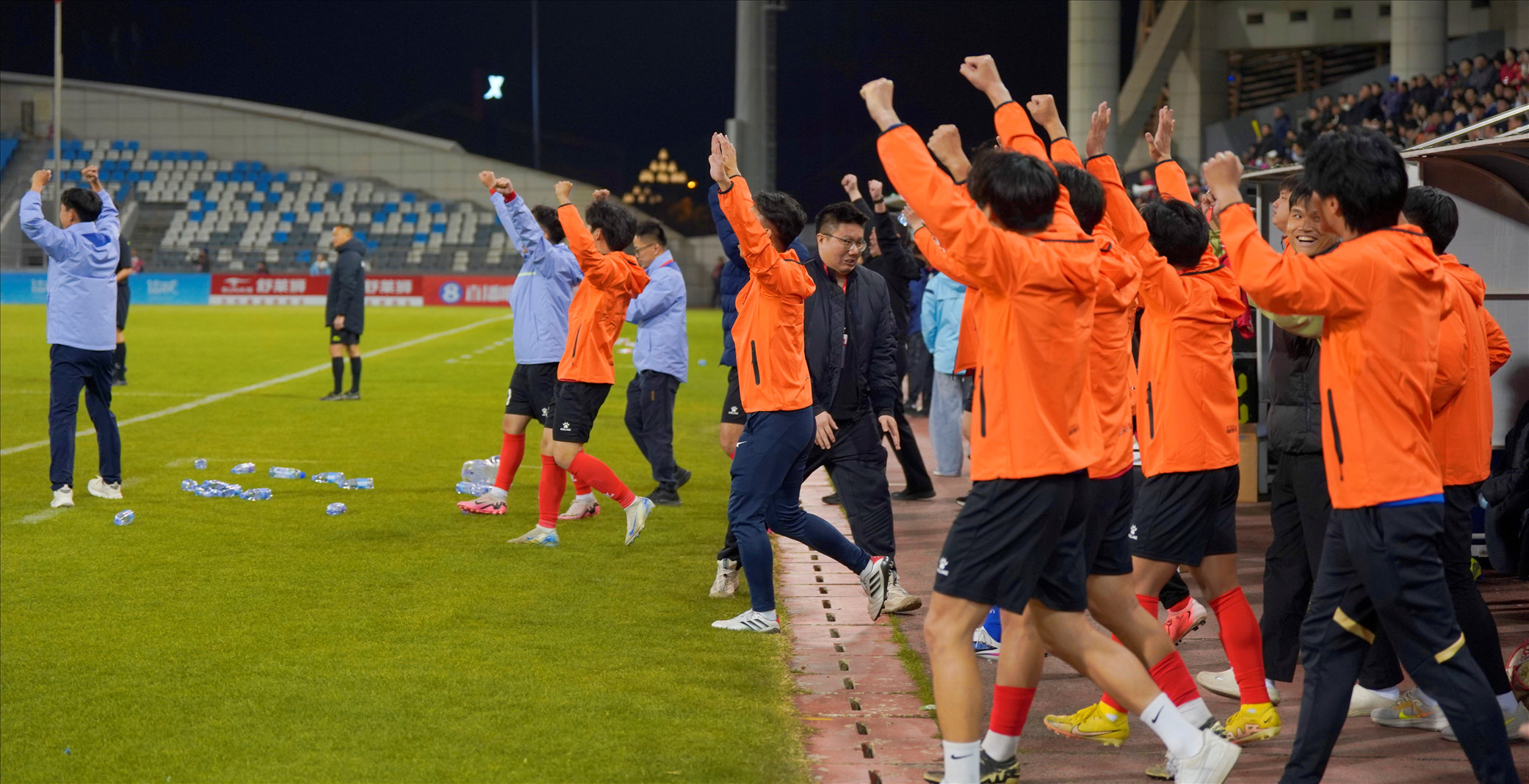 终场哨声响起,南安队替补席举手庆祝胜利