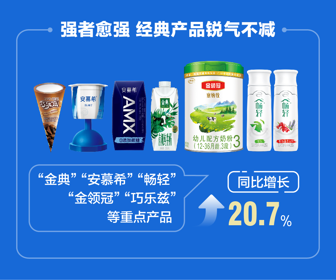 报告期内,伊利旗下重点产品继续保持着强劲增长态势。数据显示,“金典”“安慕希”“畅轻”“金领冠”“巧乐兹”等重点产品销售收入比上年同期增长20.7%,锐气不减。金典有机奶、安慕希、畅轻市占率分别位居细分领域前列,尤其是2020年下半年上市的安慕希AMX小黑钻系列、安慕希5G蛋白系列销售快速增长,显现出品牌潜力;而以“金典”A2β-酪蛋白有机纯牛奶、“伊利”臻浓高钙牛奶、“畅轻”蔗糖减半果茶酸奶、“QQ星”儿童成长配方羊奶粉、“巧乐兹”巧榛橘冰淇淋、“优酸乳”乳汽气泡乳等为代表的的公司新品销售收入占总营收比例达到15.6%,也已经成为伊利股份业绩增长的重要力量。