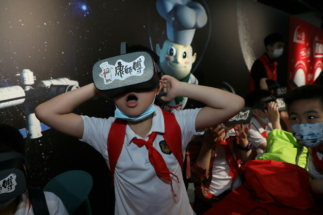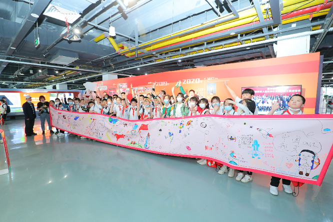 在现场,为了庆祝这场期待已久的航天科普展开幕,孩子们用一份“特别的礼物”——一幅绘满了航天梦想与武汉名胜的5米长卷献礼中国航天。在这幅长卷上,孩子们不仅生动地描绘出了武汉的众多名胜特色,还用天马行空的想象力展现了自己的航天梦。展区内,孩子们在讲解员的带领下参观形形色色的“国之重器”,了解中国航天发展史,并且通过VR等设备亲自体验了一把“太空旅行”。在航天梦想体验营中,孩子们一起回顾了空间站发射的精彩瞬间,当看到“长五B”成功升空时,现场爆发出热烈的欢呼和掌声,加油声此起彼伏,许多孩子还合唱《明天会更好》对中国航天献上祝福。