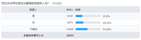 在使用过家政服务的消费者中,对服务表示满意的达一半以上。但仅有25.6%的问卷参与者表示在未来两年内会雇佣家政服务人员。从中可以看出,消费者对家政服务体验满意度尚可,但还需要进一步提高。