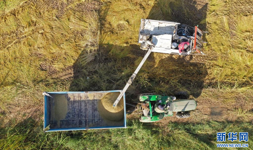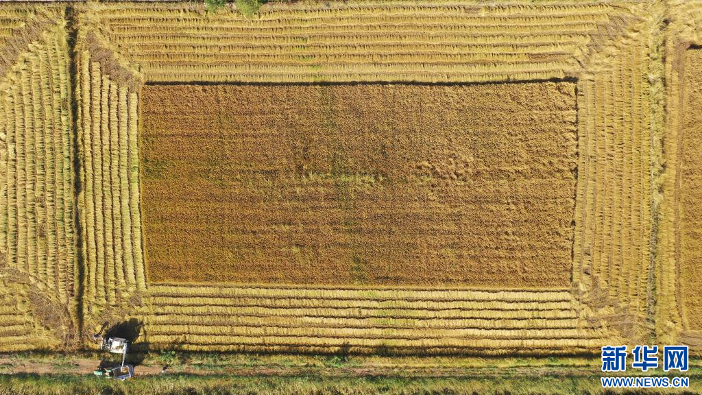 收割机在宁夏石嘴山市平罗县绿康林家庭农场收获水稻(无人机照片,9月30日摄)。 金秋时节,宁夏石嘴山市平罗县迎来水稻收获季。当地百姓利用晴好天气抢收水稻。据了解,2021年平罗县种植水稻24.89万亩,全县水稻生产机械化水平达到98%以上。 新华社记者 王鹏 摄pagebreak