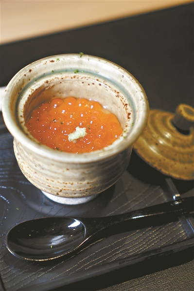 关于日料,我们最熟悉的莫过于三文鱼了。每当秋天到来时,三文鱼会洄游寻找产卵地,它们通常从河流的海洋入海口向内陆逆流而上。此时的三文鱼,体内储存脂肪,因而最为肥美。其鱼籽也迎来最佳赏味期,“旨匠”日料店的华仔师傅说,每年9月到次年的1月上旬,是新鲜三文鱼籽最好味的季节,尤其是这个月份,鱼籽量最多。新鲜的三文鱼籽在日语中称为“生筋籽”,日料的“筋籽”即用盐腌制过的三文鱼籽产品。