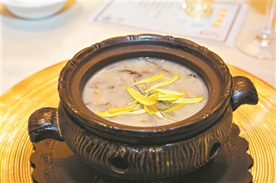 秋天滋补,重在补燥。甲鱼可养阴生津,恰是补燥的好食材。甲鱼味之美,兼有鸡、牛、羊、鱼等味道,长久以来备受广东食客与家庭喜爱。卢师傅沿用古法,烹制一道古法甲鱼羹。他采用四斤以上的甲鱼,原只隔水炖煮,再把甲鱼肉和滑溜的裙边以人手加工成丝,剩下的骨头加上老鸡熬成高汤,耗时且费人工。最后过滤出来的汤羹加入红枣丝、香菇丝、马蒂丝以及陈皮、姜和胡椒等一起再熬制数分钟。食用时拌入鲜菊花瓣、柠檬草,让温热的汤羹加持花草香气的挥发,闻之神清气爽,舀起一口,入喉顺滑,回味无穷。