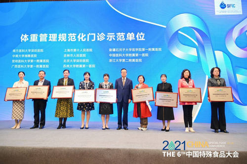 会议现场,由中国营养保健食品协会指导的“体重管理规范化诊疗门诊示范单位”评价项目正式启动。南方医科大学深圳医院、上海市第十人民医院、新疆石河子大学医学院第一附属医院、中南大湘雅医院、吉林市人民医院、中国医科大学附属第一医院、昆明医科大学第一附属医院、北京大学深圳医院、浙江大学第二附属医院、广西医科大学第一附属医院、苏州大学附属第一医院荣获“体重管理规范化门诊示范单位”。