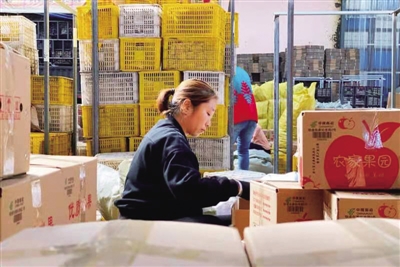 电商企业优先雇佣合作社种植户,为农民增收提供了新机会。图中为山西临猗的打包女工。郝曼 摄