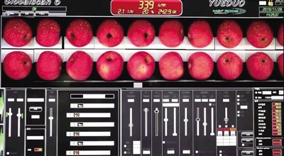 通过高频相机给苹果拍照,再通过光谱测糖仪,测定每一个苹果的糖度,综合以上数据后,机器会将苹果送往不同的分拣线分装,确保消费者收到品质稳定的苹果。
