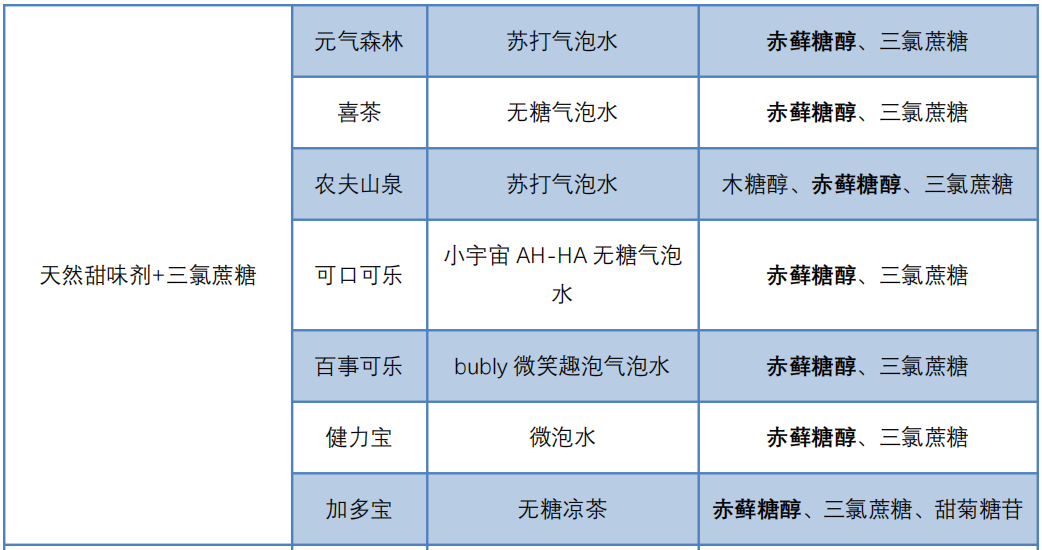 元气森林、喜茶、农夫山泉气泡水等7款饮料添加了天然甜味剂和少量三氯蔗糖。三氯蔗糖是一种以蔗糖为原料生产的高倍甜味剂,属于安全性较高的甜味剂。少量的三氯蔗糖与天然甜味剂搭配使用,可以获得更好的饮品口感,且能够满足无糖健康的需求。