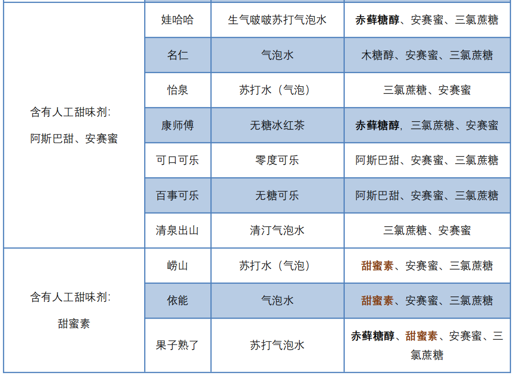 此外,娃哈哈生气啵啵、可口可乐0度可乐、百事可乐无糖可乐等6款饮料含有阿斯巴甜、安赛蜜等人工甜味剂;依能气泡水、崂山苏打气泡水和果子熟了苏打气泡3款饮料含有甜蜜素。