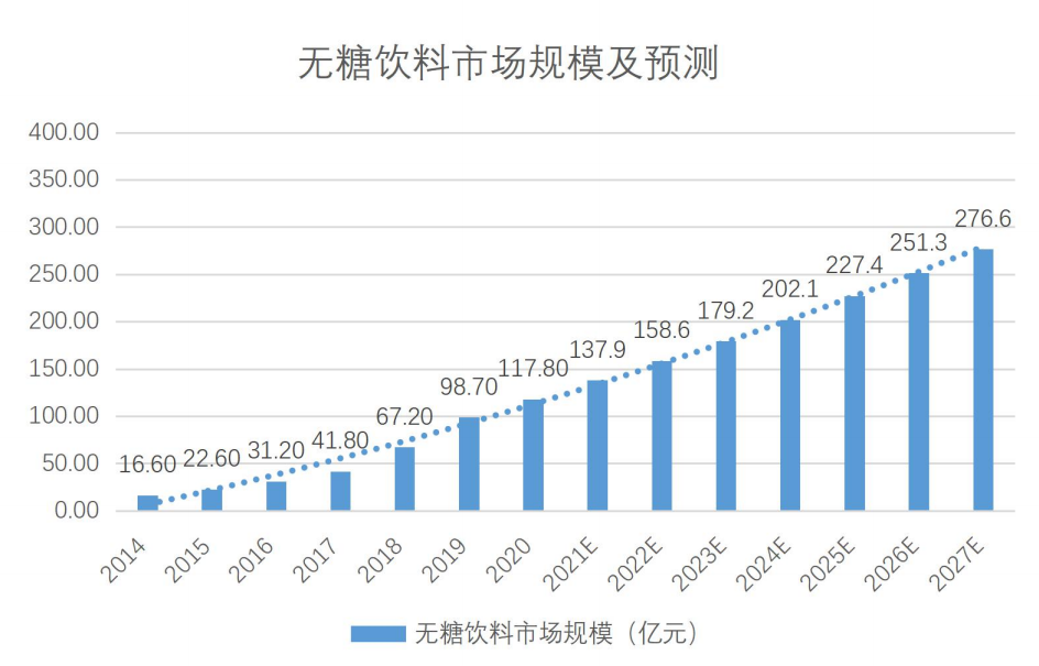 中科院报告指出,随着 2030 健康中国计划的推进以及消费者健康意识的提升,国内无糖饮料的市场规模将进一步保持增长势头。2020年市场规模达 117.8 亿元,较 2014 年翻了 7 倍。2025年该市场将增至227.4亿元,5年内实现规模翻番。2027年,该市场将继续攀升至276亿元规模。