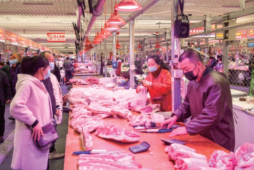 图为市民在内蒙古呼和浩特市农贸批发市场采购猪肉。 新华社记者 彭源 摄