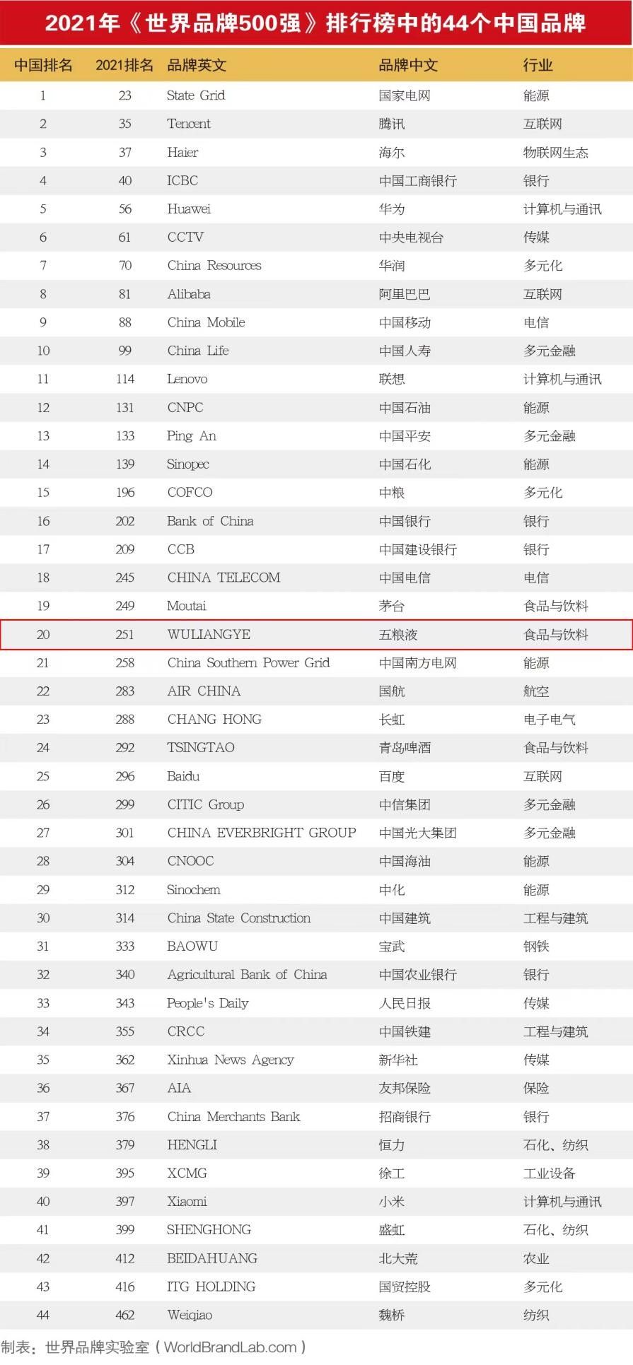 2021年《世界品牌500强》排行榜入选国家共计31个,覆盖了47个行业,有44个中国品牌上榜,五粮液与国家电网、腾讯、海尔等世界知名品牌入选。其中,五粮液位居第20位,也是仅有的5个超越百年历史的品牌之一。
