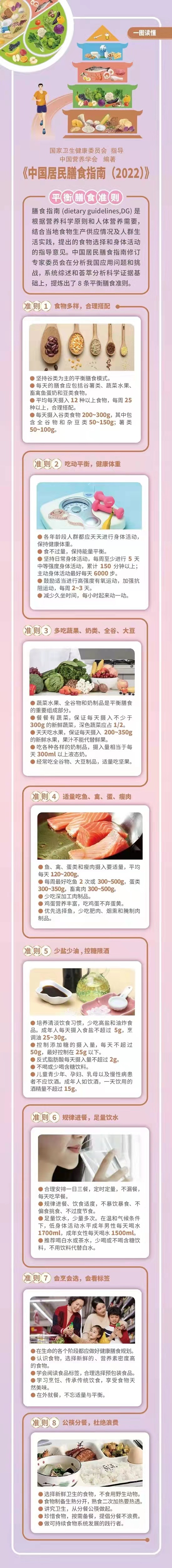相比2016年版本,本次发布的指南中提炼出了平衡膳食八准则:一、食物多样,合理搭配;二、吃动平衡,健康体重;三、多吃蔬果、奶类、全谷、大豆;四、适量吃鱼、禽、蛋、瘦肉;五、少盐少油,控糖限酒;六、规律进餐,足量饮水;七、会烹会选,会看标签;八、公筷分餐,杜绝浪费。