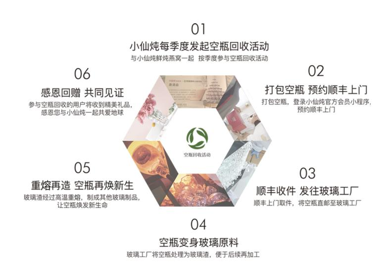 中式滋补讲究长期坚持更有效,小仙炖鼓励用户坚持长期规律滋补。大量用户通过购买月套餐、年套餐进行定时长期的规律滋补,因此也产生了大量空瓶。为践行可持续发展理念,小仙炖自2019年起发起空瓶回收公益活动,按季度发起,从用户手中回收燕窝空瓶,发往玻璃工厂处理为玻璃渣,经过高温重熔,再造为玻璃制品,让废旧玻璃焕发新生。